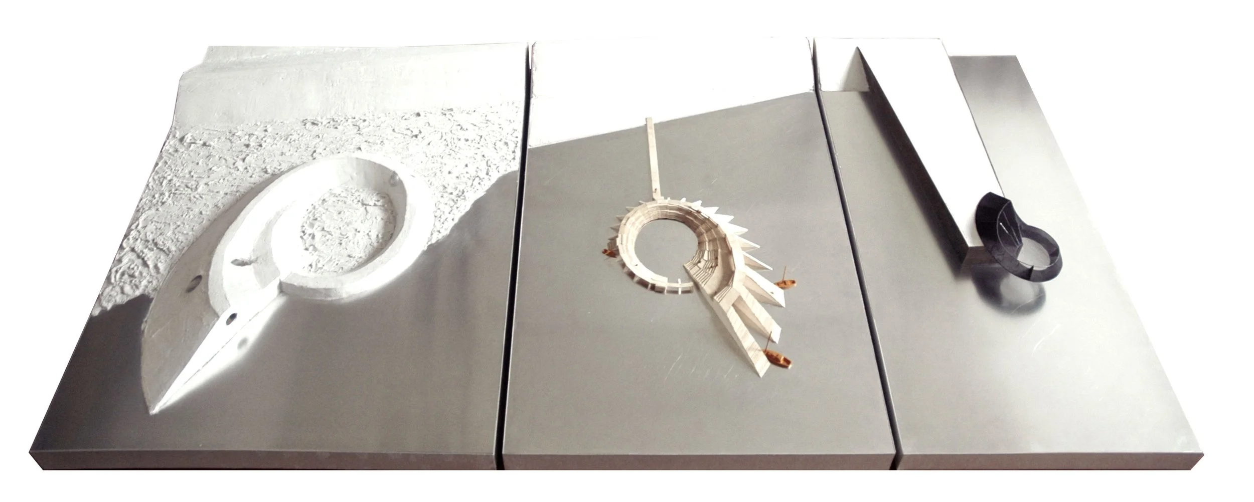 We scratch the dike. The second dike ring is placed in the Spreehafen just outside Wilhelmsburg. The 20 meter wide inner space creates a water theater; a place for the people of Wilhelmsburg to swim, fish, perform and to enjoy the tide. The ‘scratched’ outside is a small marina that makes the dike ring accessible from over water.