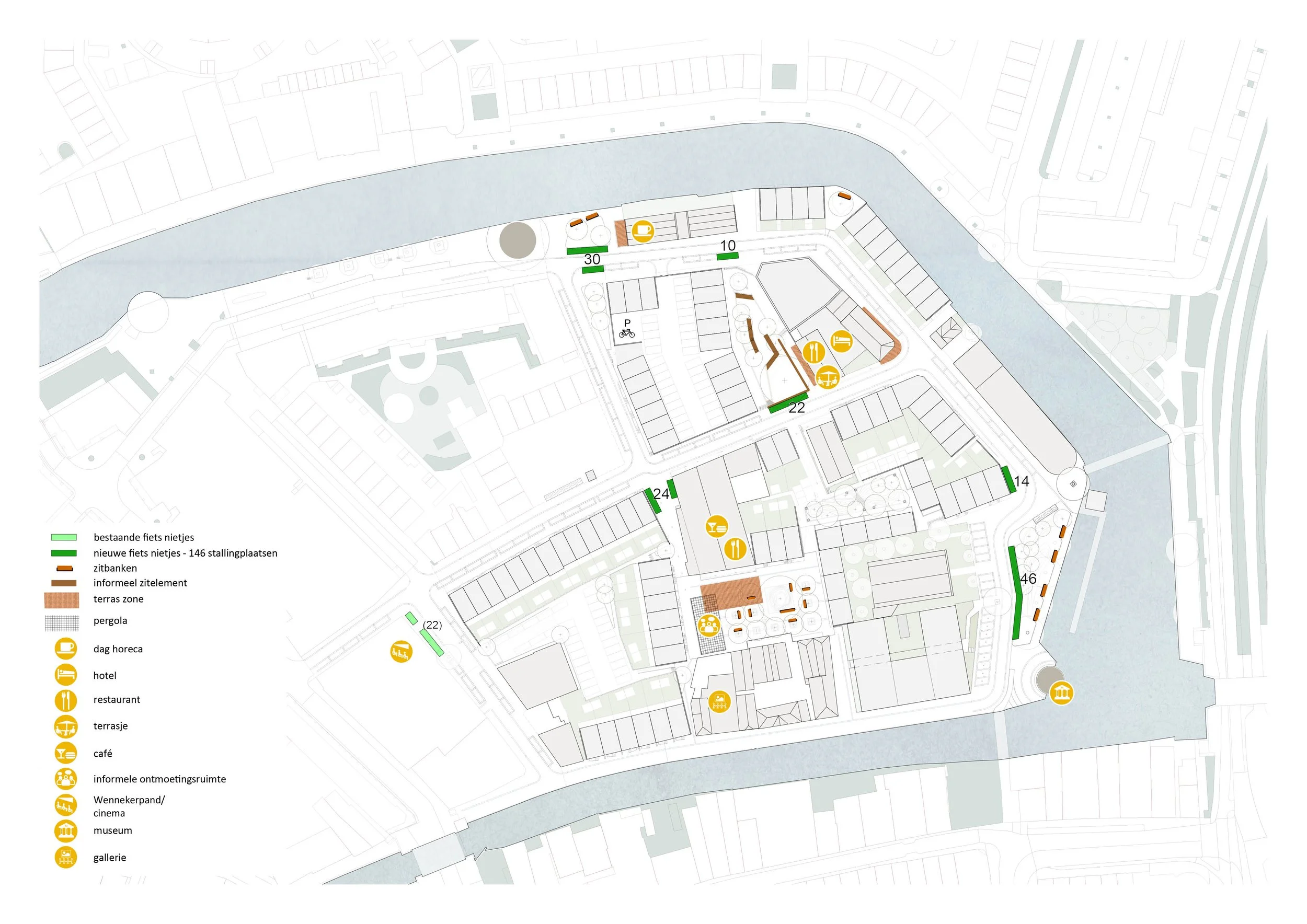 The location has a high groundwater levels, soil pollution, tight street profiles and a number of vulnerable existing buildings. We have converted the limited space into an intimate pedestrian friendly environment with compact streets in a so called “stads-erf” layout, where parking is only allowed on one side. The monuments are all given extra attention by positioning them on new squares, where only pedestrians are allowed (no cars here). The squares function as oases, planted with rich greenery.Several plan parts are being raised in order to close the ground balance as much as possible and to prevent groundwater damage in new homes. This creates subtle differences in height, which help in applying a climate-adaptive rainwater cascade in which the squares temporarily buffer rainwater and then discharged this water with a delay to the Schie and Noordvest canal. The play of elevating plan parts and connecting to existing floor levels of the monuments, has been conceived as a nuanced and detailed design assignment in the plan.