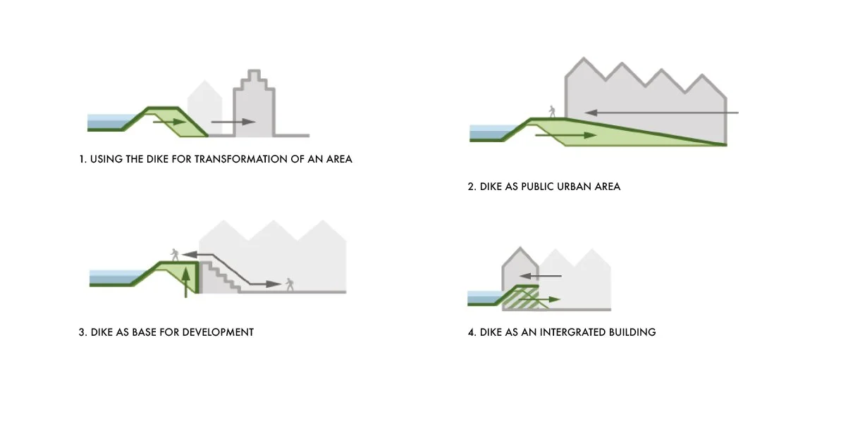 We propose a series of innovative dike designs that both strengthen their safety and improve their quality as urban spaces. After analyzing the existing Rotterdam dikes, four strategies were defined for four different locations in the city of Rotterdam: the dike as instrument to transform areas; the dike as public urban domain; the dike as a basis for urban development; the dike integrated into a building. These four strategies increase in level of complexity and each one is illustrated on its most suitable location in Rotterdam. Therefore they are designs that serve as material for discussion between different professionals, in order to understand the full potential that an integrated approach can bring to all parties involved. This project is conceived in extensive series of workshops that we led and elaborated in exemplary design proposals.