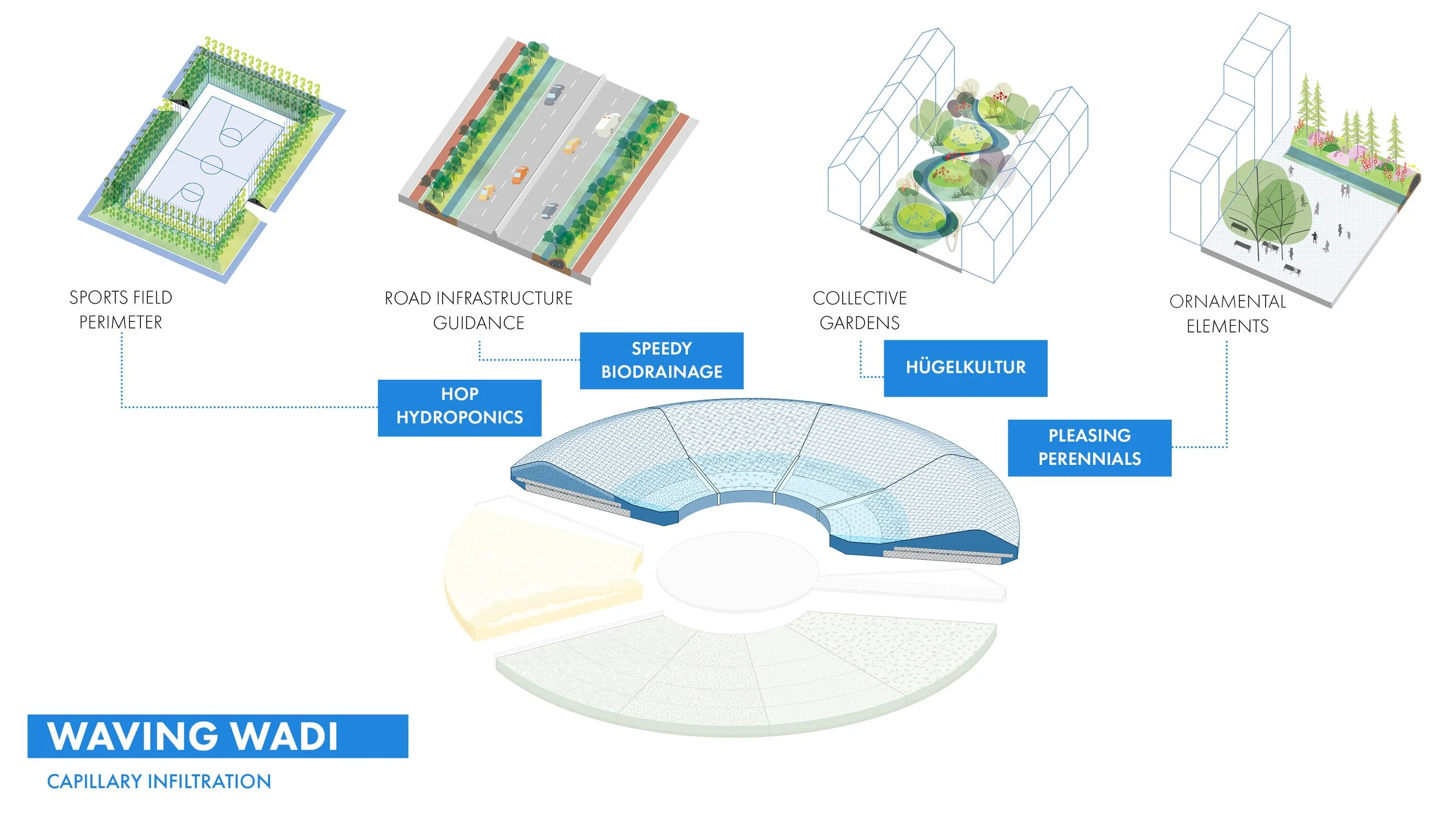 The municipality of Rotterdam is already tackling these problems by applying smart measures like water squares, swales (also known as wadis) and more open water. However, a lot still remains to be done; the city is predominantly paved and the greenery that has been planted is hardly able to mitigate the two extremes of rain and drought.
