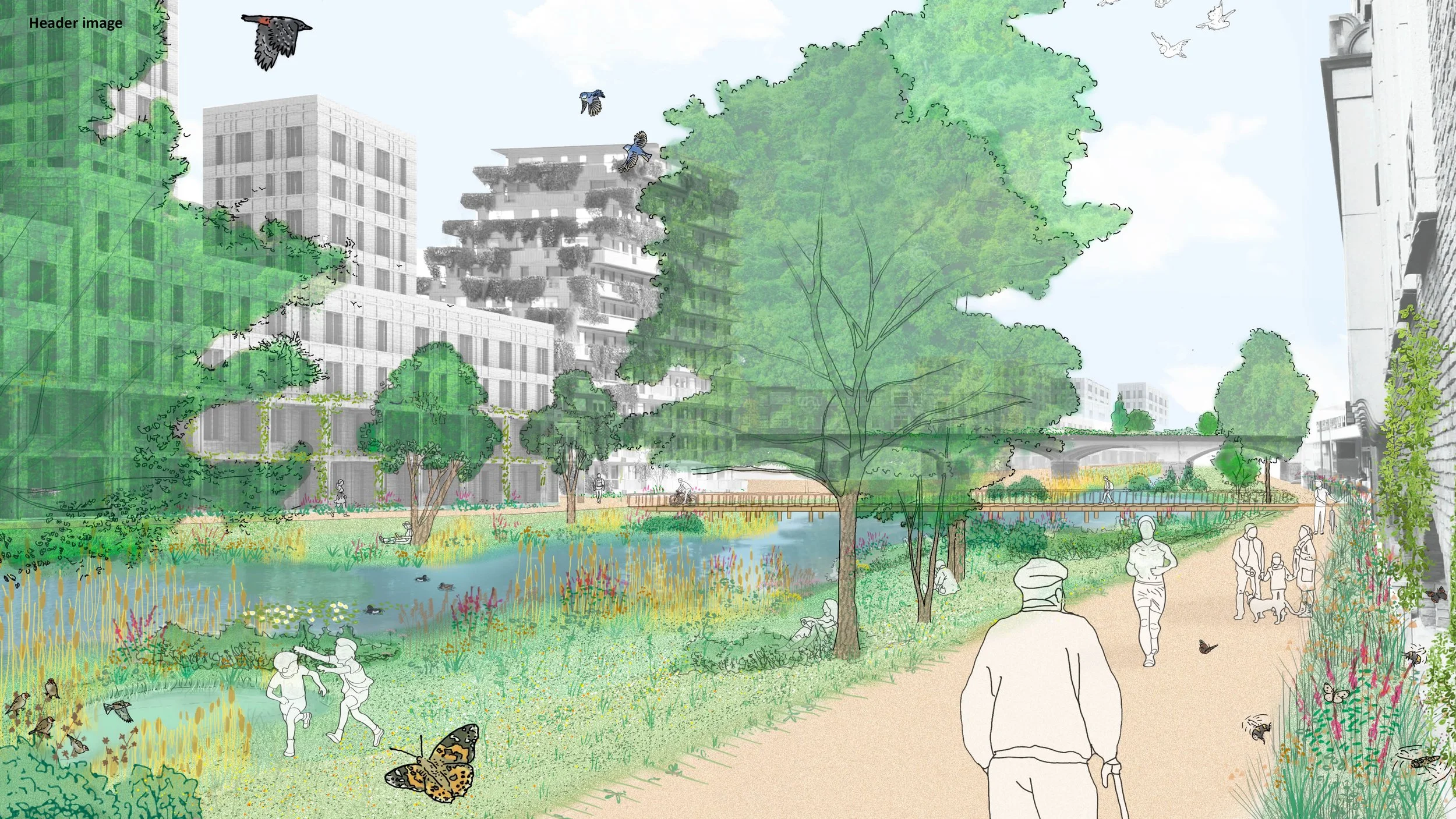 • A façade-to-façade approach with less paving and wider, more diverse planted banks
